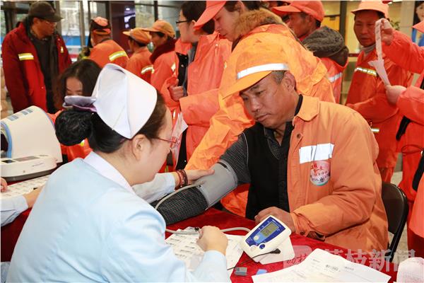 在活动现场,由江苏省职业病防治医院搭建的民工免费体检区就被一抹“亮黄色”所围绕,一百多位环卫工人正在排队进行血压测量、耳鼻喉检查等常规体检。