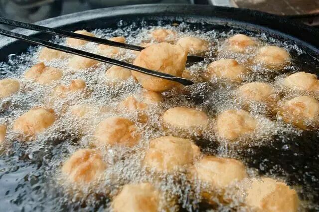 门口的这一个大油锅,热气攒动,油和团子在锅里滋滋地沸腾着。这里面就是好吃的油汆团子,外壳脆,内里软,肉汁香气四溢。
