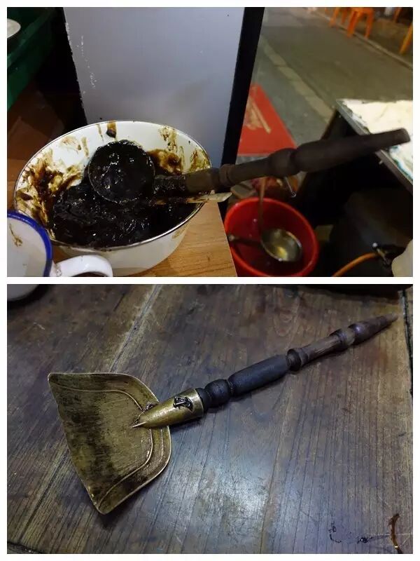 老陈重开老店,把原来搁置的几十年老物件全拿出来了。铜锅铲都是红木的柄!