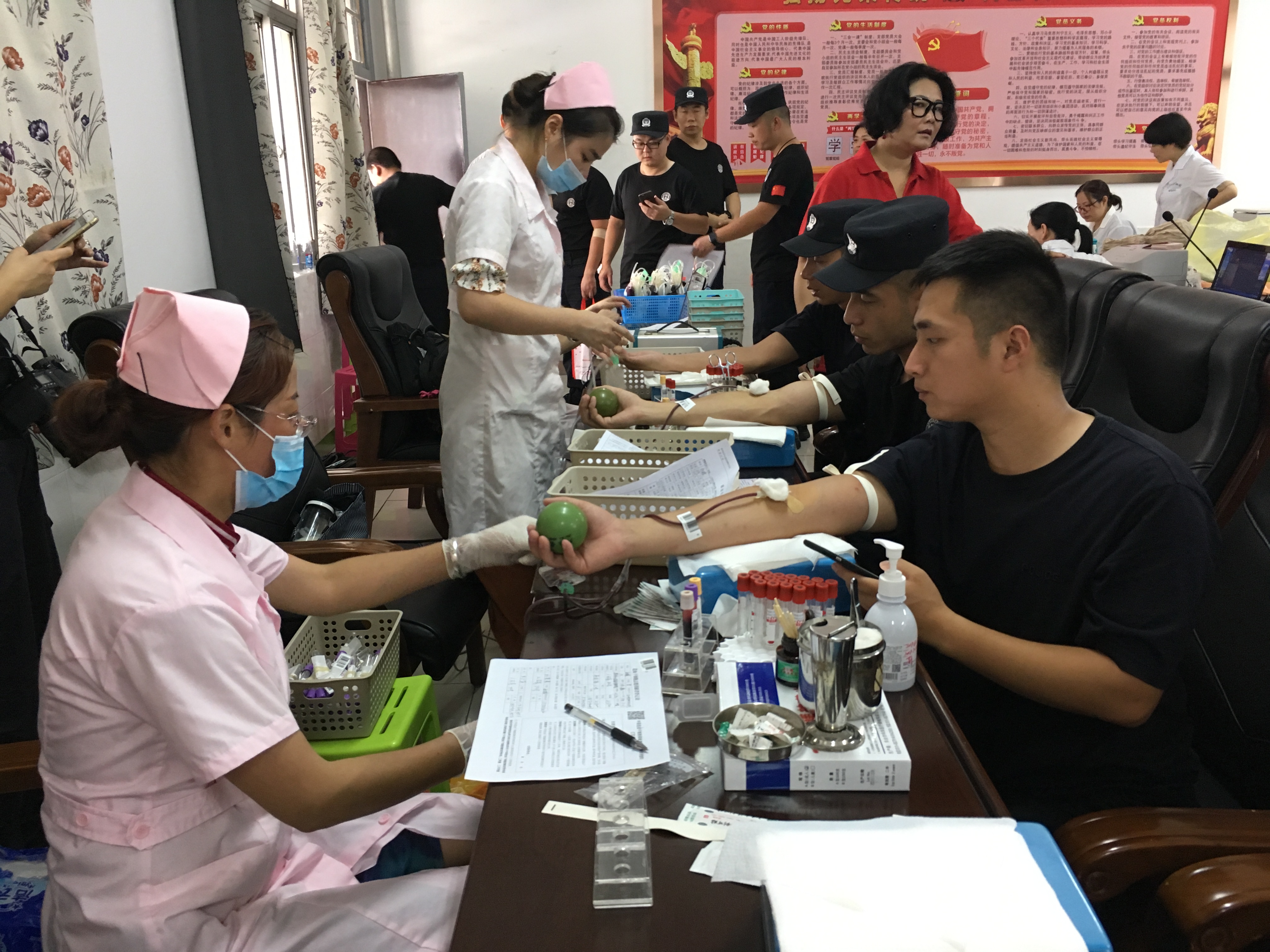 7月13日,溧阳市红十字会联合无偿献血服务志愿者协会在市巡特警大队开展无偿献血和造血干细胞血样采集活动,共有30多名公安干警参加了此次爱心捐献活动。