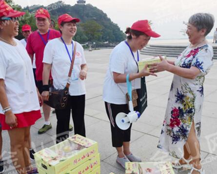 7月26日傍晚,镇江江山名洲社区网格长江坚自己花3000元买来水蜜桃,慰问四牌楼街道辖区100名金山湖巡湖志愿者,对他们高温下巡湖护鱼行动表示支持。