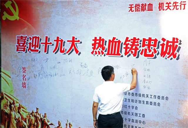 南京市临床用血长期处于紧张状态,夏季尤为明显,为缓解我市7-8月季节性缺血困境,保障全市临床用血安全,营造全社会关注、参与无偿献血的浓厚氛围,市委市级机关工委策划了此次主题为“喜迎十九大、热血铸忠诚”的活动。市级机关各相关单位党团组织从以实际行动迎接党的十九大胜利召开出发,积极做好发动、协调、服务工作,市级机关无偿献血志愿者分队的370多名机关干部积极响应号召,踊跃报名参加,共献血 65500 毫升。献血过程中,涌现出了不少感人事迹,不少单位的领导干部带头献血;有的同志已经连续多次参加无偿献血活动;有的同志是路过看到,临时加入到了献血行列当中!正是这些机关党员干部充分发挥先锋模范作用,影响带动了全市社会各界积极参与无偿献血公益事业;正是这些机关党员干部以强烈的社会责任感,用热血铸就忠诚,用爱心托起希望,以实际行动践行了一名共产党员的承诺。