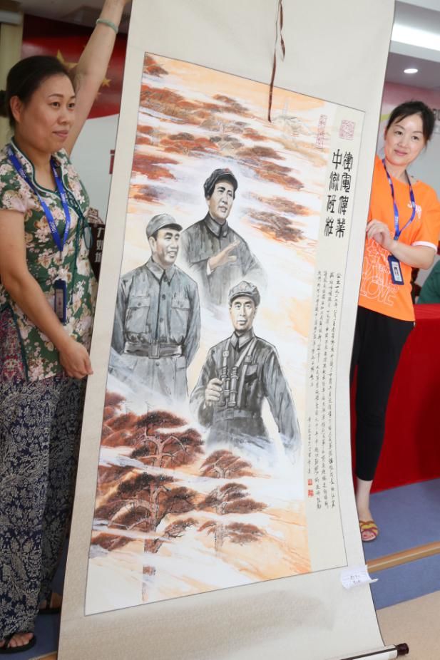 江苏省广播电视总台高级美术师黄志毅,现场展示了最新创作的国画《建军伟业 中流砥柱》。画面以人民军队缔造者毛泽东、周恩来、朱德形象为主体,通过云蒸霞蔚渲染中的高大松树、红军长征胜利到达的延安宝塔山为远景,红色基调突出的喜庆氛围,画出了人民军队前赴后继走向胜利,谱写民族独立和人民解放新篇章的宏伟气势。堪称精品力作!