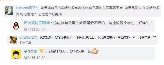 他(金子添)是尽力去做了,在学校也主动做劳动委员。也要感谢那个摄影师,很有心地拍下来,无锡是一个倡导地铁文明出行的城市,儿子这么做,也是一种文明的传递。