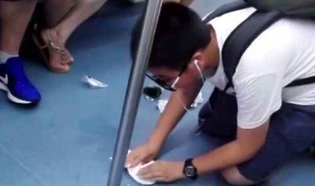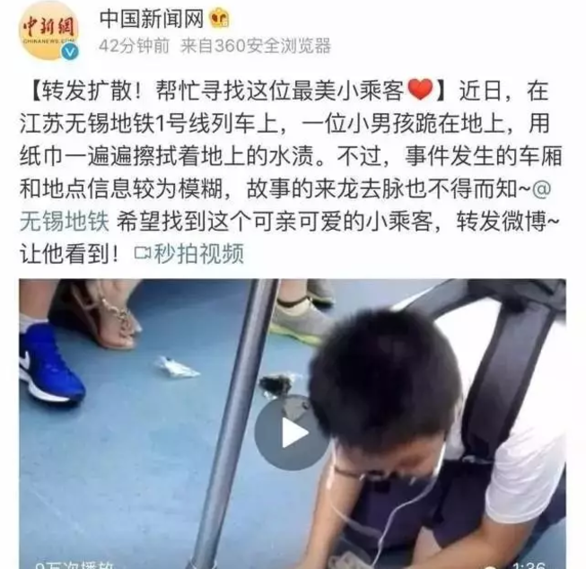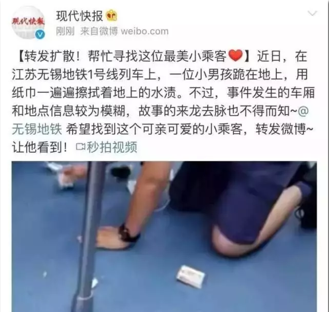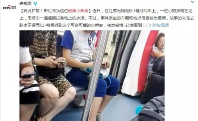 起因是因为一位网友录制的视频:行驶中的地铁车厢内,一名小男孩默默跪在地上,用纸巾一遍遍的擦拭车厢地面的水渍。