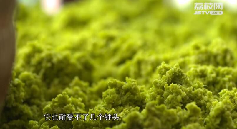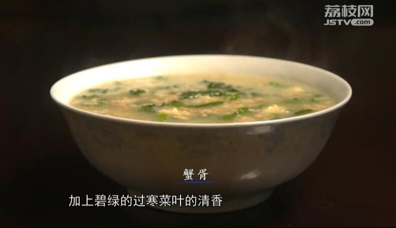 中国人吃螃蟹的历史悠久,做法百变。从郑玄所注的《周礼》中可知,螃蟹在西周时期就已经出现在了天子的食单中,而这个最远古的记载中螃蟹的做法就是蟹胥,这里蟹胥指的就是蟹酱。周承祖每次做蟹胥也会顺带做一点蟹酱,因为两者主要的加工方式相同。但做蟹胥时,螃蟹要在石杵里捣上更长的时间,捣到蟹壳几乎不见踪影的糊状才算过关。捣烂后的螃蟹装在纱网里面用水滤出肉汁。剩下的残渣也不能浪费,在锅里加水煮开后滤出残留的汁液。做好的蟹汁盛起来放一边,就可以开始调面疙瘩了,起锅之前还必须加上撒上蔬菜来搭配,做好的蟹胥既有蟹子的鲜味,又有面团的软和充实,加上碧绿的过寒菜叶的清香,应有尽有,尝鲜的同时还能果腹。
