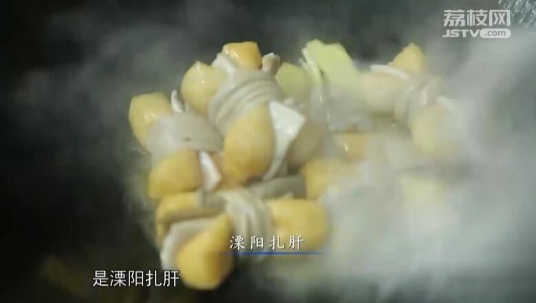 扎肝是溧阳地方新年里必备的菜式。把一片五花肉,一片猪肝,一片油豆腐,一片笋干叠放在一起,用一段猪小肠扎起来下锅红烧。它的做法据说是从北宋时传下来的。当时贫穷的百姓人家,客人来了也买不起什么好菜,于是就搜罗出家中能找到的一切零碎食材,想个法子绑在一起烧,竟然别有滋味。