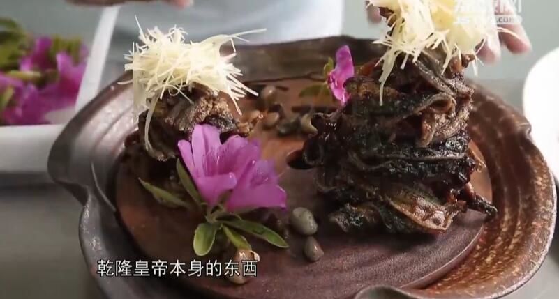 无锡境内的梁溪出产一种上好的黄鳝,称为秤杆船,这种鳝鱼大小适中,制作脆鳝口感极佳。黄鳝脱骨后经过热油反复烹炸,水分基本出尽,肉质脆化,层层叠加之后远观江南太湖石,立体感颇强,在乾隆宴中这道菜被称为游龙锈金钱,袁辉决定让它返朴归真。“叫游龙锈金钱,牵涉到比较多的是乾隆皇帝本身的东西,那我觉得他到了江南是不是能够从菜肴上把江南园林的那种味道体现出来,那我就看到那个八音涧,它是有假山,它后面还有树,还有声音,那我就想,那么脆鳝无论从形上,还有从它的一种虚的方面充分表达出来。”袁辉说。