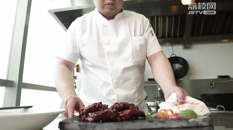 无锡肉骨头是锡帮菜中最负盛名的代表菜,它的原料来自当地特产太湖猪,肋排在红曲米水中熬制,几分钟后既可上色均匀。无锡人做菜离不开甜,锡帮菜的精髓即为咸出头,甜收口,以往制作无锡肉骨头糖必不可缺,但随着人们对饮食健康的重视,糖的份量和比例不断下降,新的替代品也因运而生,李峰用罗汉果果糖代替传统的蔗糖,口感不变但菜品的健康指数却大大提升,配合砚台状的石质容器,一道经典菜肴立刻多了几分水墨味道。