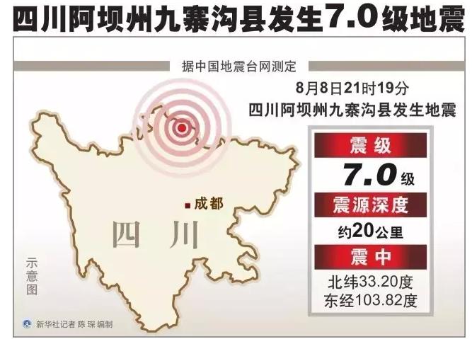 据中国地震台网正式测定,8月8日21时19分在四川阿坝州九寨沟县发生7.0级地震,震源深度20千米,震中位于北纬33.20度,东经103.82度。