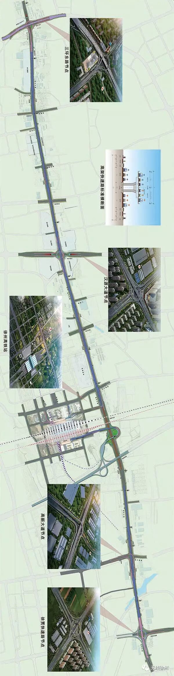 根据规划,汉源大道立交为涡轮式全互通立交,徐贾快速路立交远期也将建成全互通立交。城东大道高架快速路全线5座立交示意图如下:
