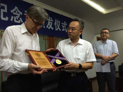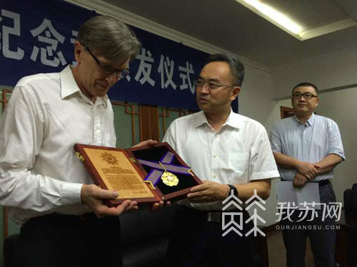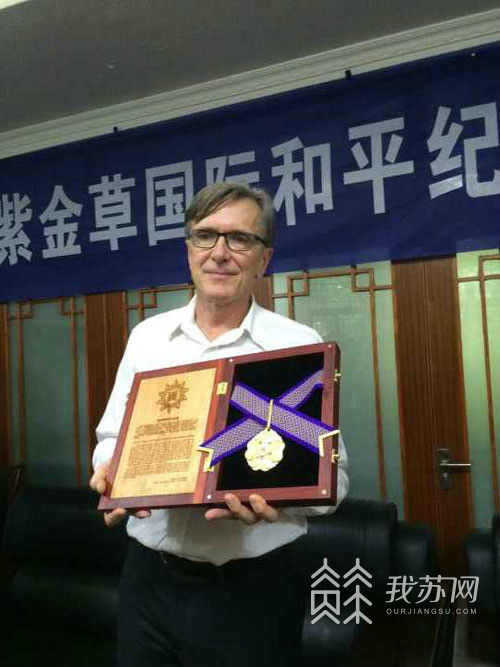 8月14日下午3点,由侵华日军南京大屠杀遇难同胞纪念馆主办的紫金草国际和平纪念章颁发仪式在南京市第十二中学举行。南京市委副书记龙翔向国际友人约翰·马吉之孙克里斯·马吉先生颁发紫金草国际和平纪念章,以表达南京人民对80年前,在南京大屠杀期间,约翰·马吉无私救助难民的感恩和敬意。