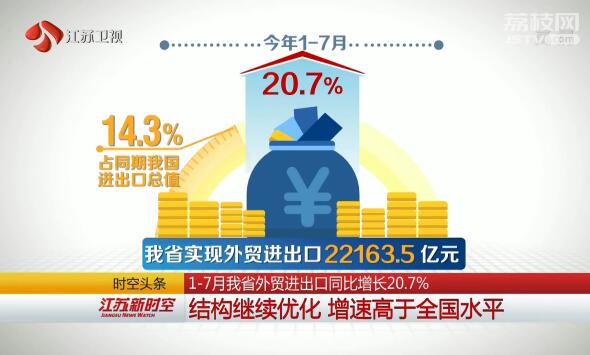 据南京海关统计,今年1-7月,江苏实现外贸进出口22163.5亿元,比去年同期(下同)增长20.7%,占同期我国进出口总值的14.3%,占比较去年同期提升0.4个百分点;其中出口13602.2亿元,增长18.2%,占同期我国出口总值的15.9%;进口8561.3亿元,增长24.9%,占同期我国进口总值的12.2%。