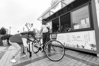 龙西社区“爱心驿站”提供纳凉休息、茶水供应、租借雨伞轮椅拐杖、自行车打气等服务