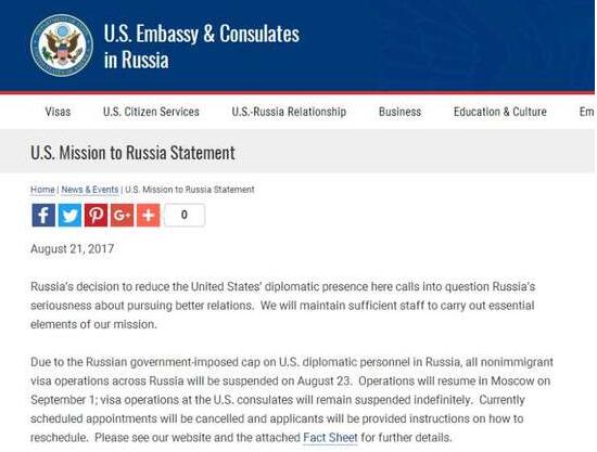 美国大使馆在声明中表示,“由于俄罗斯政府对美国驻俄外交人员施加的举措,俄罗斯全境所有非移民签证运作将于8月23日暂停。”