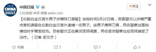 【伦敦白金汉宫外男子涉嫌持刀袭警】当地时间8月25日晚,英国警方以涉嫌严重伤害和袭警在伦敦白金汉宫外逮捕一名男子。该男子携带刀具,两名警察试图拘捕他时手臂受轻伤。目前警方正在事发现场调查,两名受伤警察也在现场接受了治疗。
