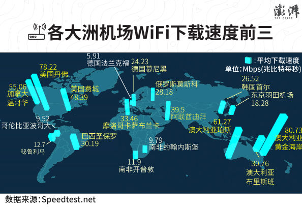 根据SpeedTest统计的六大洲共78个最繁忙的机场的网速数据显示,全球机场WiFi网速最快的集中在北美洲和大洋洲。在这78个机场中,WiFi下载速度最快的机场是澳大利亚的黄金海岸机场,其下载速度达到80.73Mbps;而下载速度最慢的机场是南美洲委内瑞拉的西蒙·玻利瓦尔国际机场,其网速只有0.86Mbps。