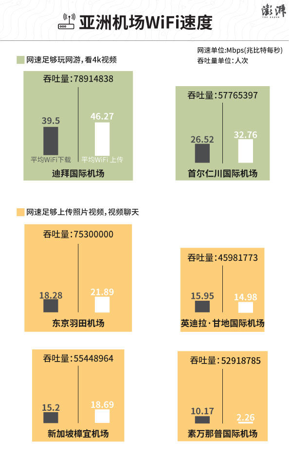 这样的网速是什么概念呢?如果根据SpeedTest的网速标准,在亚洲的机场中,只有迪拜国际机场和首尔仁川国际机场,可以流畅地的观看4k视频。而其他机场的网速有的可以流畅的上传视频、进行视频聊天等(如东京、新德里、新加坡、曼谷),有的则可能只能用来收发邮件或访问社交平台。