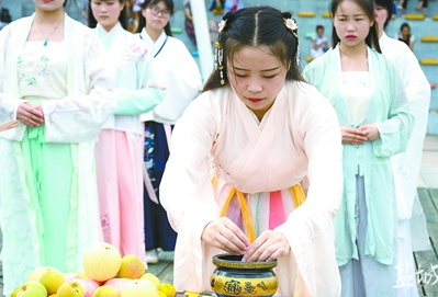 More than 50 Hanfu fans in Yancheng gathered in Yandu Park on Monday evening for an incense lighting and libation ceremony, which was the custom for Qixi festivals in ancient China.