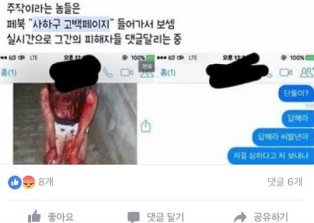 照片中,是脸书聊天室的对话截图,以“釜山沙下区的女子中学生集团”为题,还有一名少女跪在血泊中,低头“忏悔”的照片。据了解,被害人受到残忍凌虐,不仅被拿钢条和椅子痛殴,还被烟头烫伤,甚至朝她吐痰并踩她的脸。