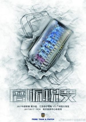 紧接着,苏宁予以回击,他们以“磨砺蜕变”为主题,以当下最火的iPhone新品发布会以及朋友圈刷屏的十年前手机追忆话题为切入点,并结合球队目前的状况,表达出球队将以崭新的姿态突破并战胜曾经的自己的愿望,而对阵联赛领头羊也是对于球队“蜕变”效果最好的验证。当然,“蜕变”这一主题也回应了恒大“本色”的主题,希望让对手“变色”。可以说,这是本赛季苏宁在海报方面为数不多超越恒大的一次。