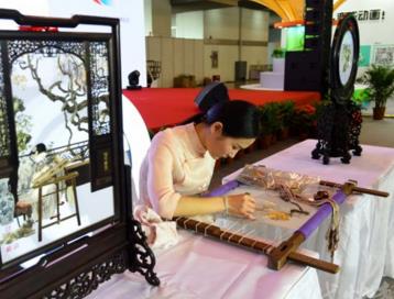 " 这幅作品叫《佳果引灵猴》。" 锡绣工作室负责人倪雪告诉现代快报记者,由于锡绣制作复杂,而且工期都比较长,因此像《佳果引灵猴》这幅作品至少要花半年的时间才能完成。除了锡绣制作技艺展示,无锡展区还带来了省级非遗项目宜兴青瓷的制作表演,也吸引了无数观展者围观。