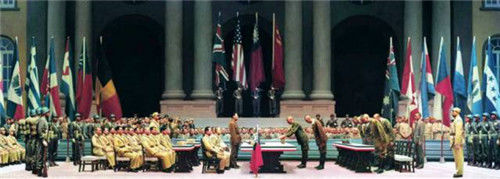 同年9月2日,日本投降仪式在东京湾“密苏里”号军舰上举行,标志着二战结束。9月9日,中国战区的受降仪式在南京原中央军校大礼堂举行。日本派遣军总司令、日本投降代表冈村宁次在无条件投降书上签字。