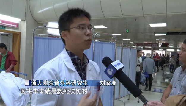 25岁的刘家洲是淮安人,目前是通大附院普外科的一名研究生。9月20日晚上,南通市区工农路金飞达广场路段,一名男子不慎倒地,后脑在出血。刘家洲正巧从此路过,看到这个情况,他迅速冲了过去,为伤者紧急止血。