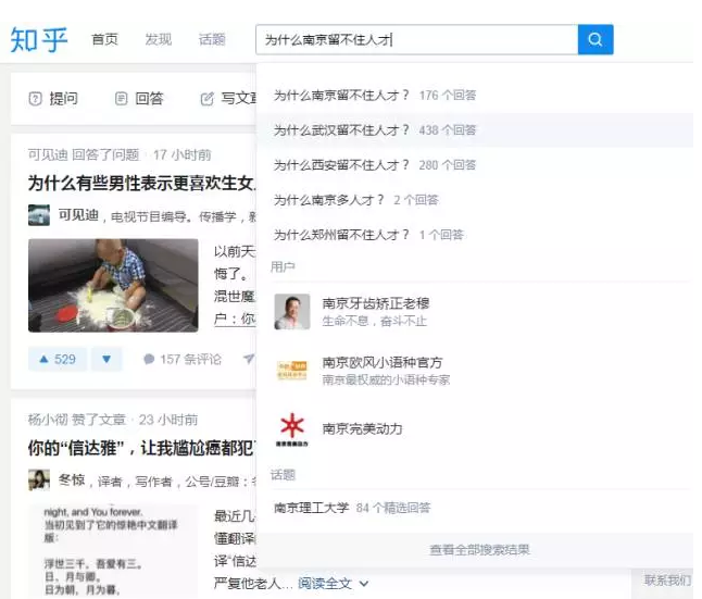 打开知乎搜索栏,“为什么XX留不住人才”的问题在很多同类城市都有讨论。把南京改成武汉、西安、合肥、成都,都可以问同样一个问题。与北上广等城市争夺人才,这是所有同类城市共同面对的问题,并非南京一个城市遇到这样的问题。