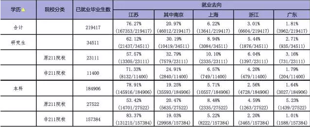 其中,选择在南京就业的江苏高校毕业生为4.7万人,占江苏高校毕业生总数达到21.75%,比前往上海(1.5万人)、浙江(0.74万人)、广东(0.48万人)等经济发达省市就业的毕业生比例都要高得多。而2017年南京的高校生源数为1.2万人,实际选择在南京就业的江苏高校毕业生人数是生源数的近四倍,人才呈现出“净流入”的状态。