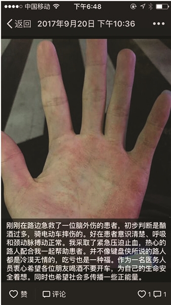 路人栽倒在地,后脑勺大量出血并伴有呕 吐,情况危急!扶不扶?就读于南通大学附属医院普外科的硕士研究生、“90后”小伙刘家洲,毫不犹豫地冲上前救治伤者。抢救结束后,他无意中拍下一张自己 沾染鲜血的手掌照片,很快刷爆朋友圈。和他一起停下脚步参与抢救的,还有外卖小哥和出租车司机,以及一起把伤者送往医院的路人……这是9月20日晚,南通 工农路上发生的一件暖心事。