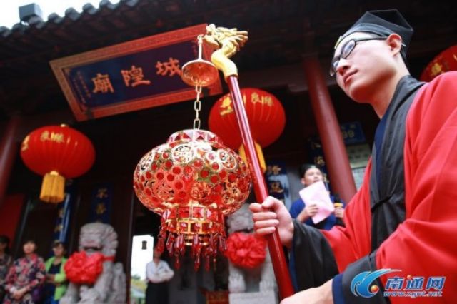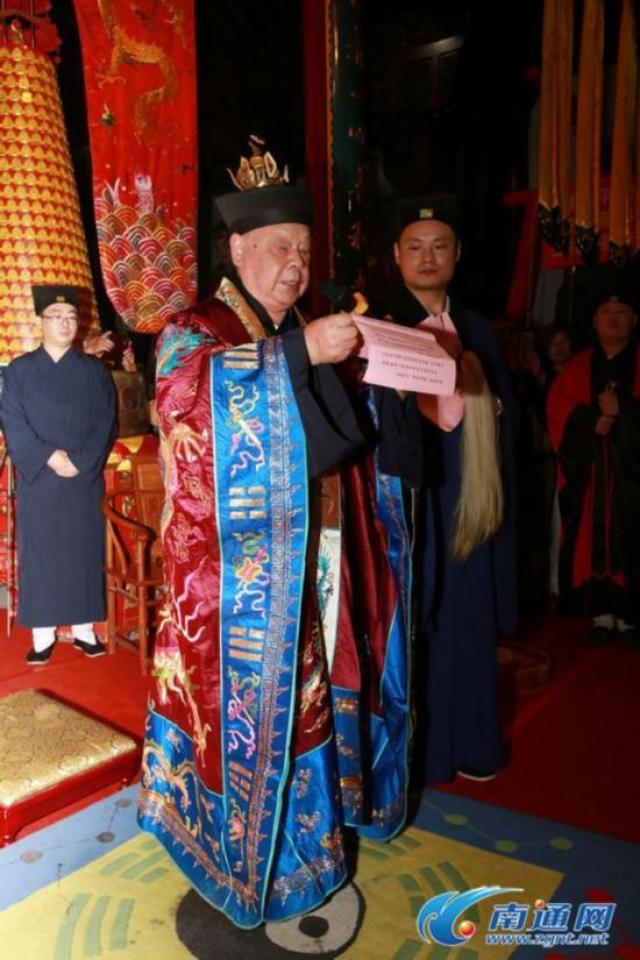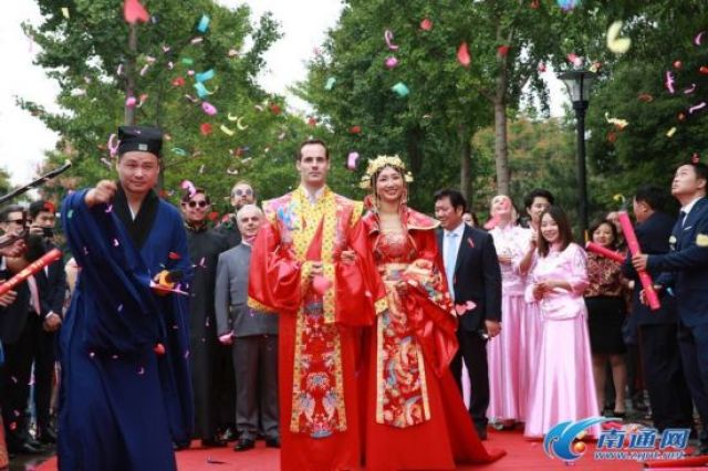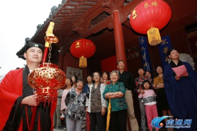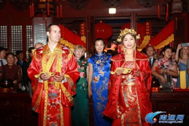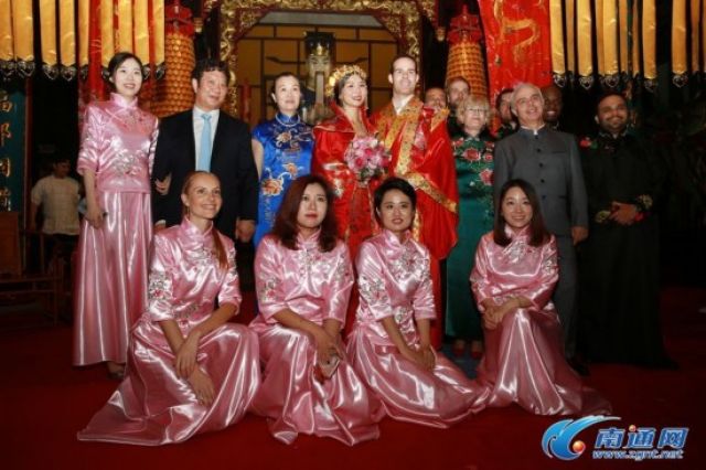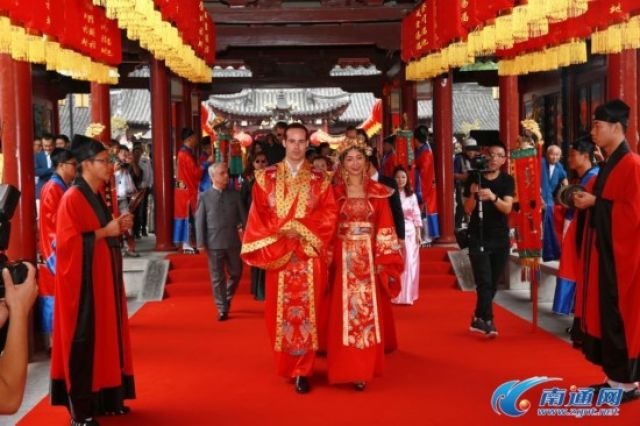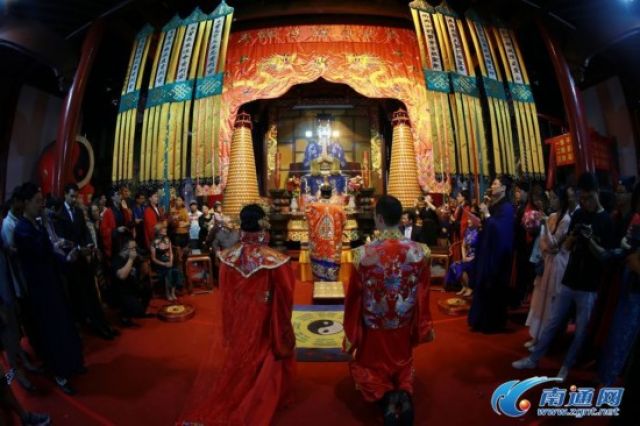 “天赐良缘喜联姻;永结同心燕双栖;吉门开罢福光照,夫妻同心入殿前。”9月23日(农历八月初四,也是二十四节气中的秋分),虽然天公不作美,国家5A级旅游景区濠河风景区(东北侧)――南通城隍庙内张灯结彩,一派热闹喜庆的氛围,当日上午9时20分,天后宫首次为在瑞士工作的一对喜爱道家文化、信奉道教的新人举行道家婚礼。