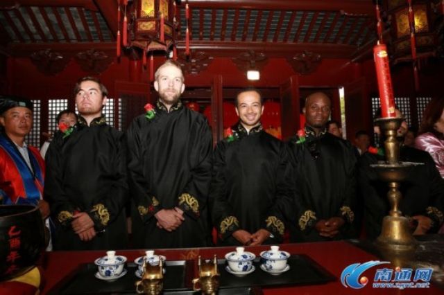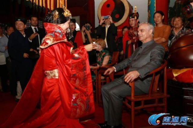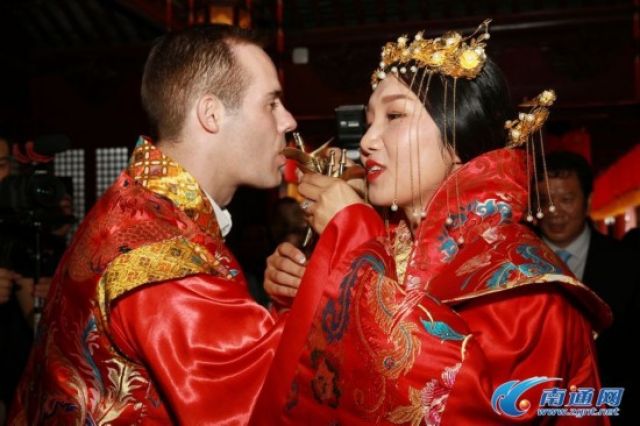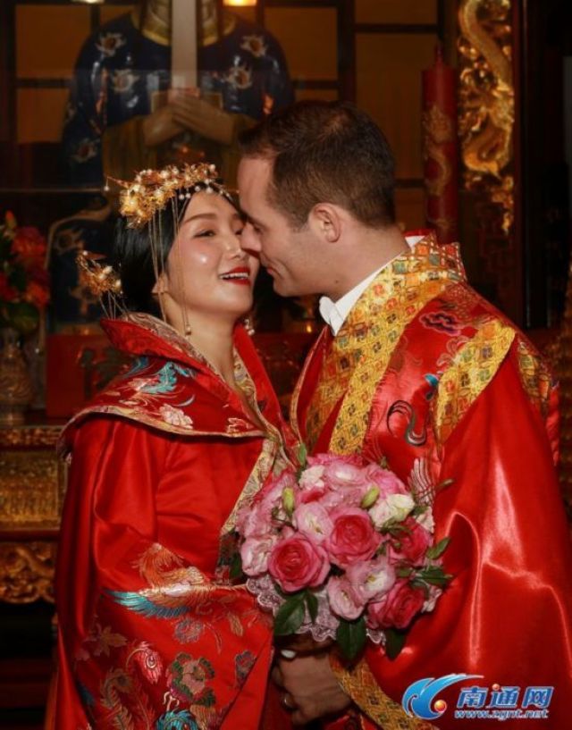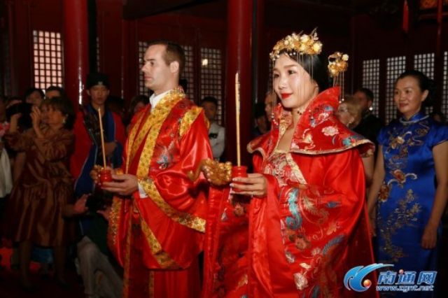 美国籍新郎许家乐与中国南通新娘许甜甜在瑞士工作时相识,他们夫妻二人对传统文化有着共同的喜爱,加上家中也供奉妈祖,机缘巧合促成今天在城隍庙天后宫举办此次道家婚礼,就想体验一场不一样的婚礼。“自己信仰道教并崇尚道教文化,特别向往道家婚礼。”新娘许甜甜说。