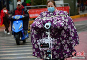 10月9日,内蒙古多地大幅降温,在呼和浩特街头,骑电动车的行人穿上“棉衣”出行。 中新社记者 刘文华 摄
