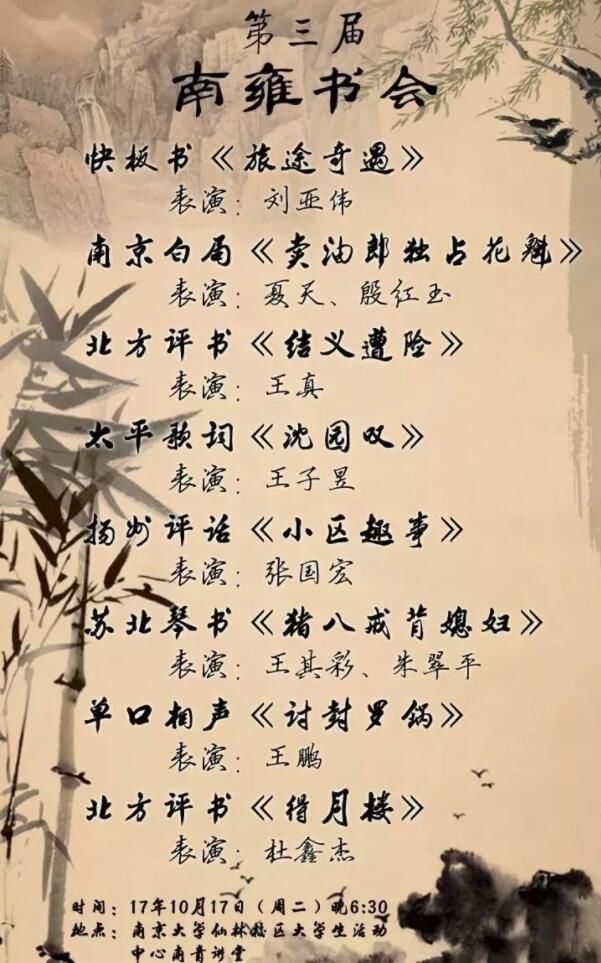 这一场亮点十足的曲艺盛会是否让你心动?10月17日(周二)18:30,相约南京大学仙林校区大学生活动中心南青讲堂,感受欢声笑语。