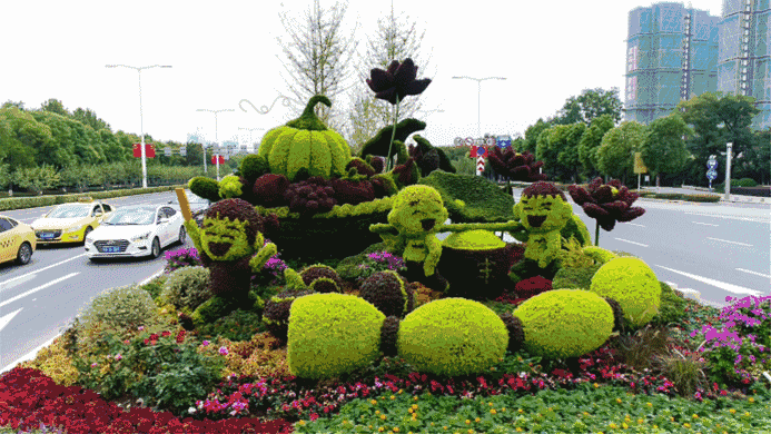 “丰收”绿雕在南京南站玉兰路北侧岛头,以生态环境为题材,生动的描绘了秋季喜悦丰收的场景。展现了江南水乡的秀美风景,优美风光、五谷丰收展示着南京的独特魅力与风采。花朵争相开放、牧童吹响竹笛、瓜果溢香,把这里丰收的幸福和希望传递给每一个热爱生活的人。作品不仅蕴含着人民对未来的期待与展望,还象征着人与大自然的和谐发展。