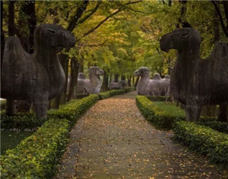 除了惊艳的斑斓秋景,路的两侧分布的六种石兽,狮子、獬豸、骆驼、大象、麒麟、石马,每种四只,两立两卧,此情此景中倒显得十分可爱。