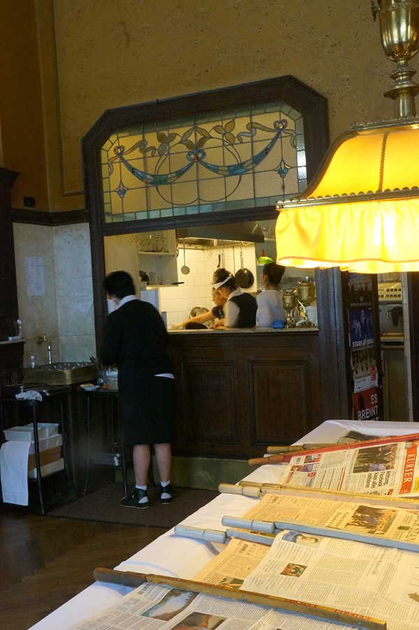 最初开业于1923年,曾经是犹太艺术家最钟情的咖啡馆。二战期间这个咖啡馆几乎全部改头换面,直到1986年,新主人接受手之后,仍旧保留了咖啡馆数量可人的牌类游戏,台球桌和免费杂志、书取之不尽。侍者在端来一杯咖啡的同时,会送上一杯白水,和一小碟方糖。三个碟子摆满一桌,不着急赶人的意思。