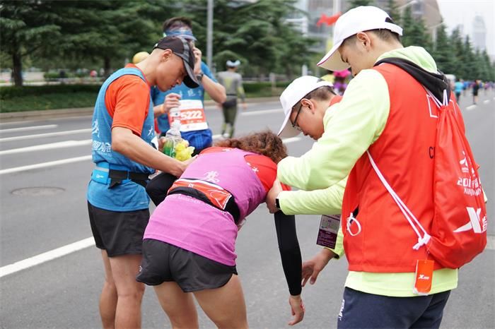 在临近半马终点,一名身着紫色参赛服的运动员在20.85km处突然倒地,在附近值守的志愿者陈孟涛同学第一时间拨打了最近医疗点救护车电话。但因道路堵塞,救护车无法快速赶到,正在送伤员到半马终点医疗站的救护车上的医生,迅速跑到伤员身边,发现患者为心跳骤停,立即进行CPR(心肺复苏术)。与此同时,张橙飞快跑到救护车上取来AED(体外心脏除颤仪)给患者除颤,经过一段时间救治,患者心跳得到恢复,护士随后给伤员输液,当呼叫的救护车赶到后,志愿者协助医生一起,将其送往军区医院,另一辆继续将日籍跑者送往半马终点医疗站。