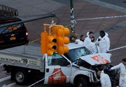 当地时间2017年10月31日,美国纽约,美国当地时间周二下午3点15分,在纽约下城发生枪击案,一名驾驶卡车的嫌犯突然向路边行人开枪射击。图片来源:cfp视觉中国
