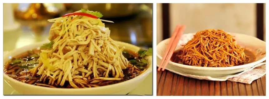 这两道可谓是扬州早点名菜,黄豆加工成大白干,切成细丝,反复洗烫,去尽豆腥味,浇上精制卤汁及芝麻油,佐以姜丝、虾米而成。色泽素雅,软嫩异常,鲜美隽永。
