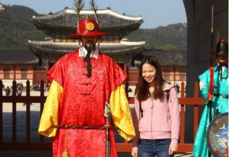 资料图片:在韩国首尔景福宫外,中国游客与韩国守城门将合影。 新华社记者姚琪琳摄
