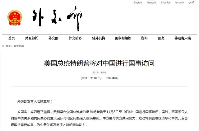 应国家主席习近平邀请,美利坚合众国总统唐纳德·特朗普将于11月8日至10日对中国进行国事访问。届时,两国领导人将就中美关系和共同关心的重大国际与地区问题深入交换意见。中方愿与美方共同努力,推动特朗普总统访华和中美元首会晤取得重要成果,为中美关系发展注入新的强劲动力。