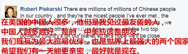 在美国的中国人很多,他们是我见过最友善的人,中国人越多越好。是的,中美应该是朋友。我们既互为最大贸易伙伴,也是世界上最强大的两个国家。希望我们有一天能更亲密,最好就是现在。