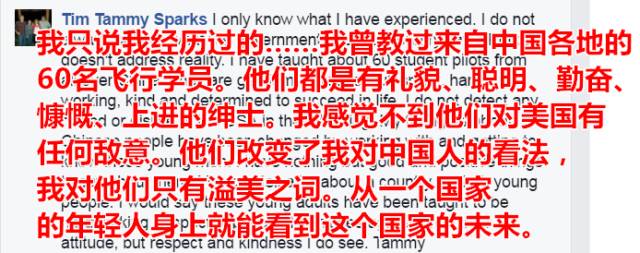 我曾教过来自中国各地的60名飞行学员。他们都是有礼貌、聪明、勤奋、慷慨、上进的绅士。我感觉不到他们对美国有任何敌意。他们改变了我对中国人的看法,我对他们只有溢美之词。从一个国家的年轻人身上就能看到这个国家的未来。