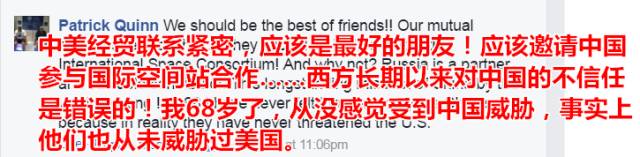 中美经贸联系紧密,应该是最好的朋友!应该邀请中国参与国际空间站合作……西方长期以来对中国的不信任是错误的!我68岁了,从没感觉受到中国威胁,事实上他们也从未威胁过美国。