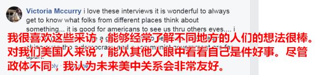 我很喜欢这些采访,能够经常了解不同地方的人们的想法很棒。对我们美国人来说,能从其他人眼中看看自己是件好事。尽管政体不同,我认为未来美中关系会非常友好。