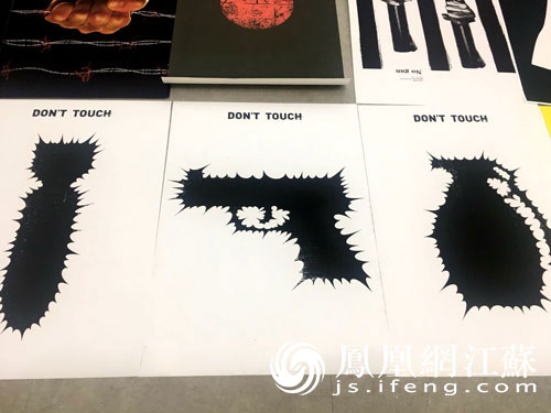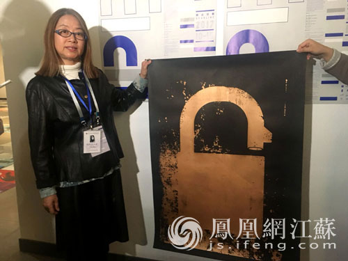 评委曹方正在展示“2017南京国际和平海报双年展”全场大奖