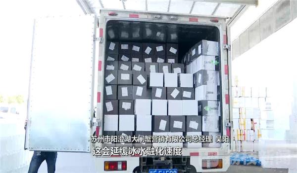 苏州市阳澄湖大闸蟹营销有限公司总经理吴阳:“我们首先里面放一个泡沫箱,本身泡沫箱起到一个保温作用,然后泡沫箱里放一个保温袋,保温袋里我们有一瓶冰水,冰水上面还套一个保温袋。这会延缓冰水融化速度,这个保鲜的时效大概在48小时,48小时之内不会有任何问题。”