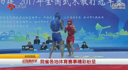 十一月十三日,为期一周的2017全国武术散打冠军赛在扬州开赛,全国44支代表队、400多名选手参赛,该赛事是国内武术散打项目最高级别的赛事。在苏州吴江,400多名皮划艇选手在太湖里追风逐浪,参加2017中国全民休闲皮划艇总决赛。